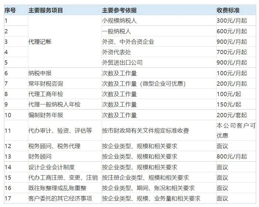 上海代理記賬收費(fèi)價(jià)目明細(xì)表(僅供參考)